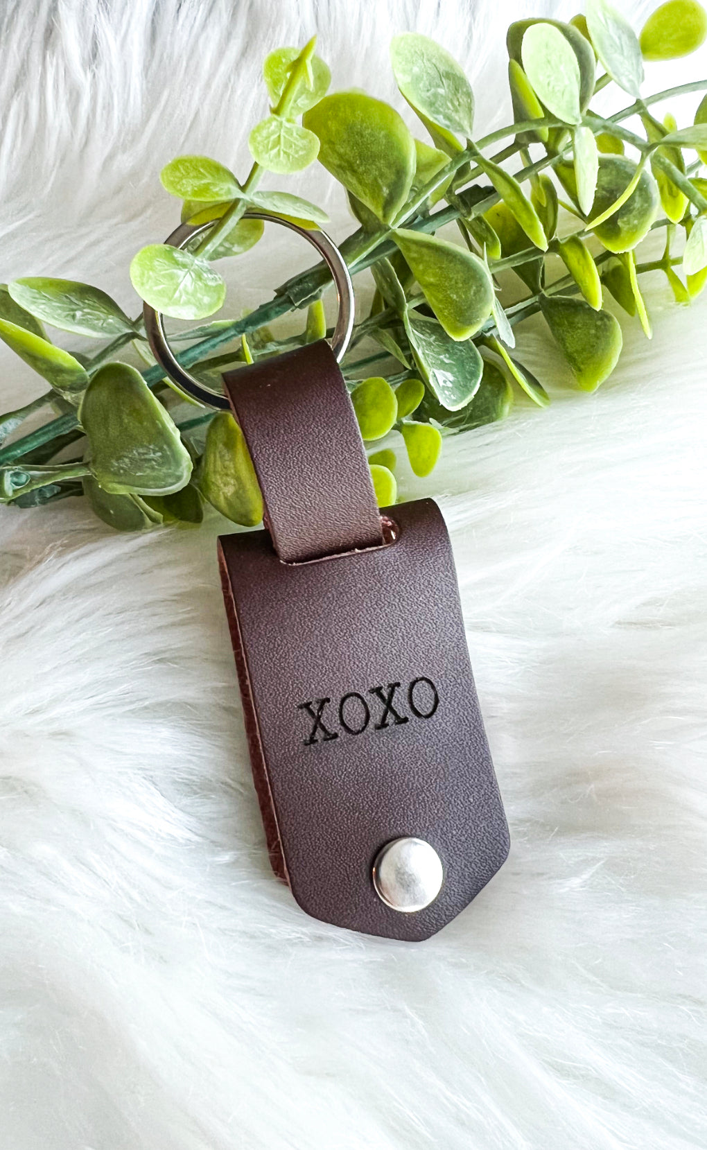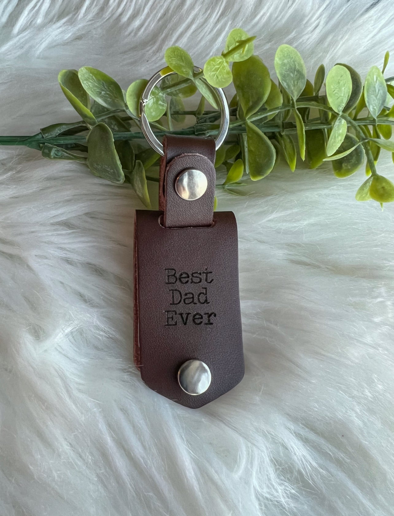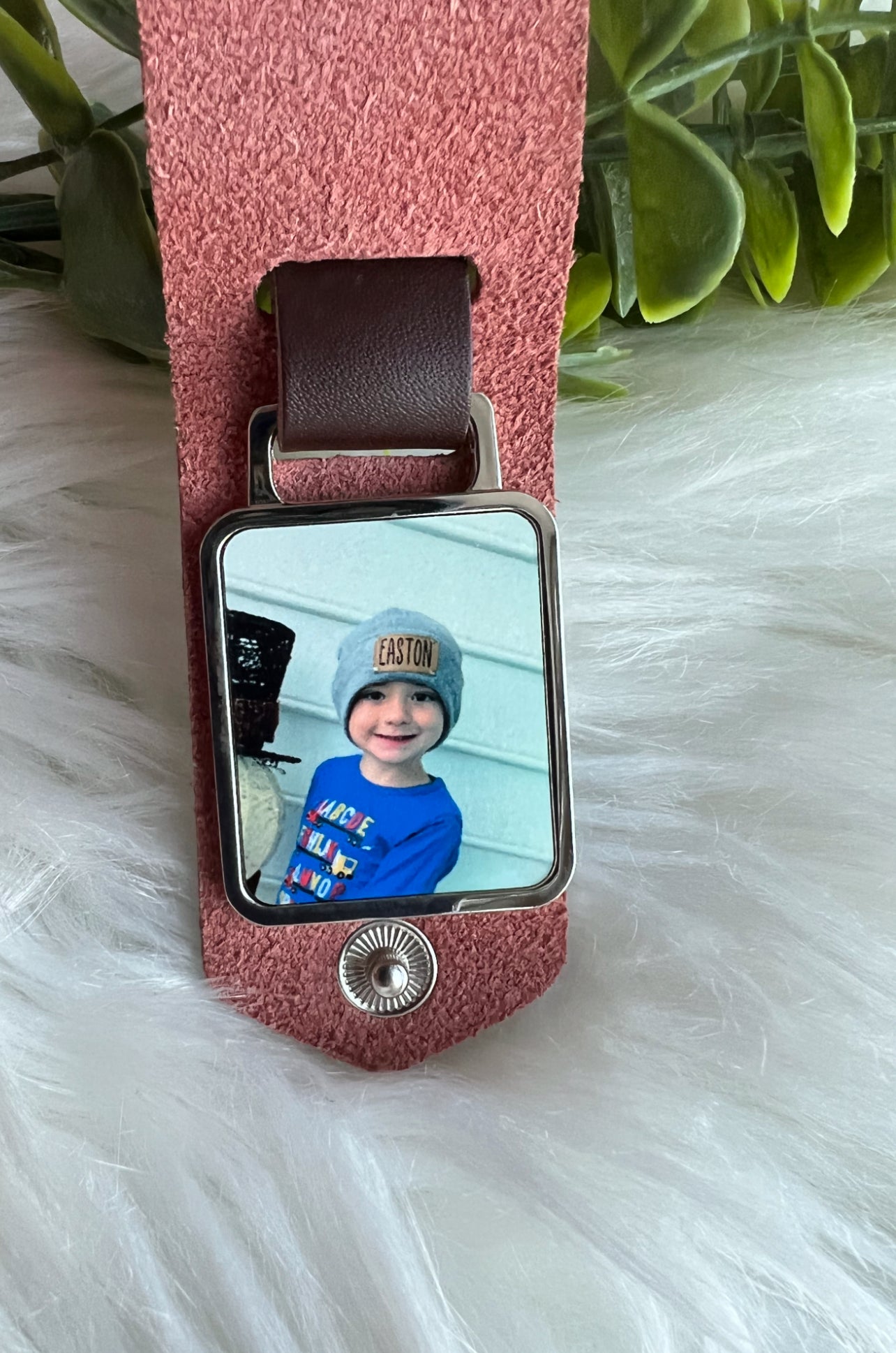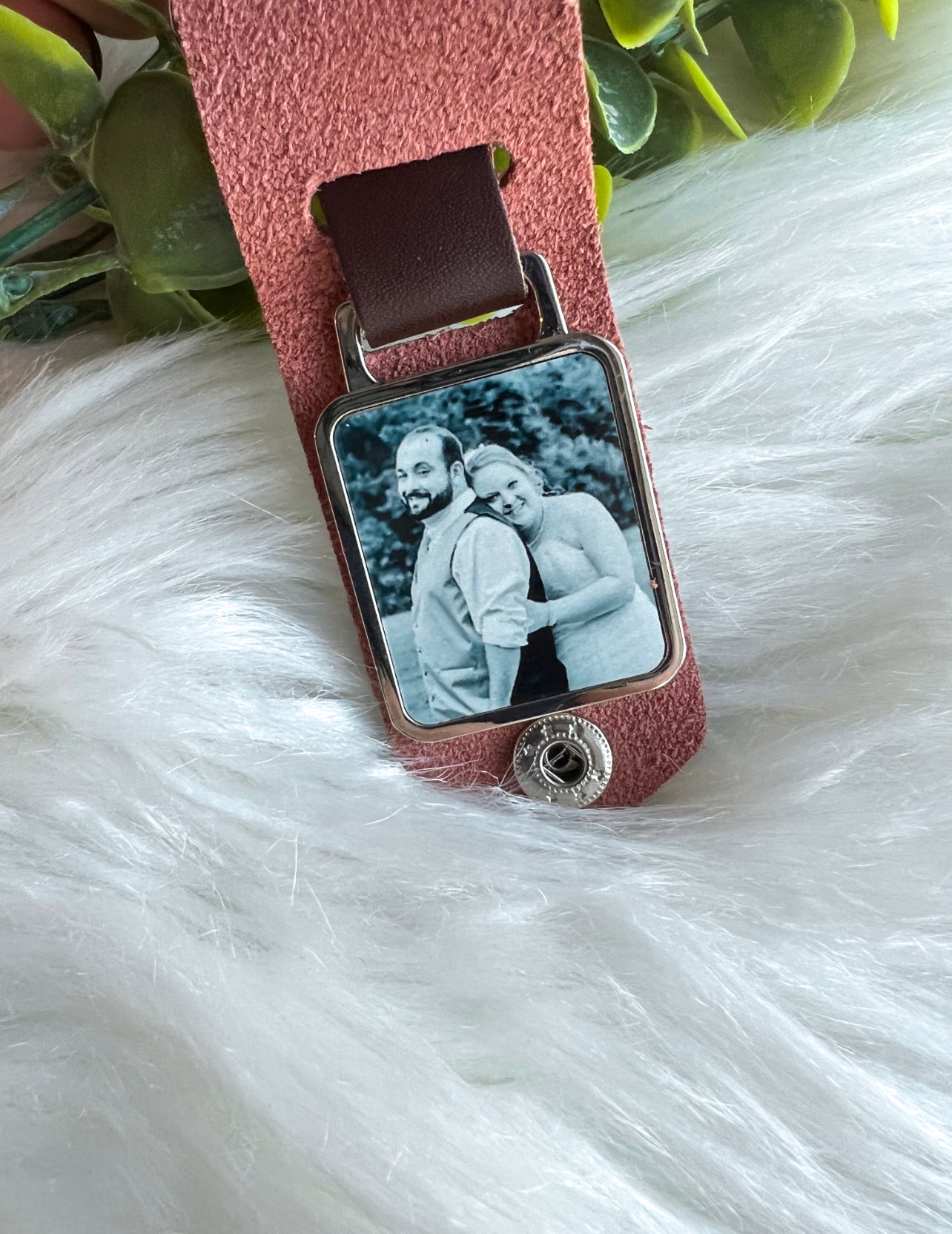 Vegetable Tanned Leather Keychain with a double sided charm for 2 photos. The leather can be engraved with any saying you’d like.