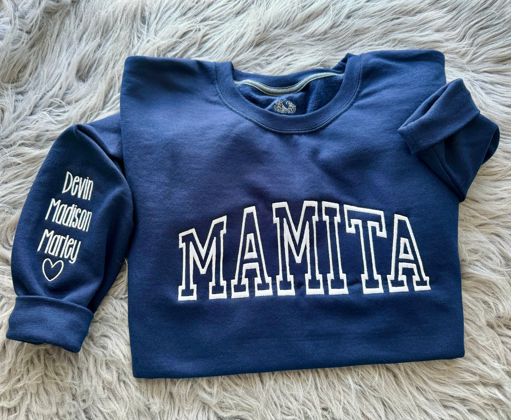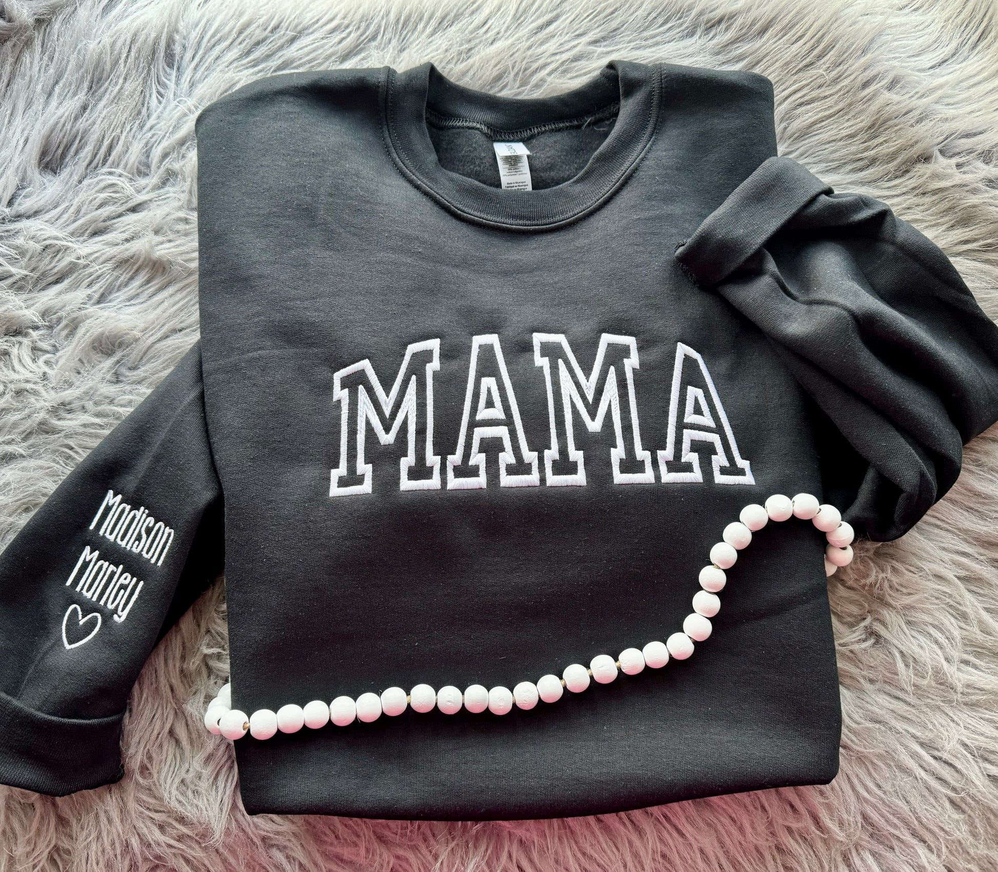 Please note what size, crewneck color, thread color and the title with names for the sleeves you’d like in the notes section on the cart page.