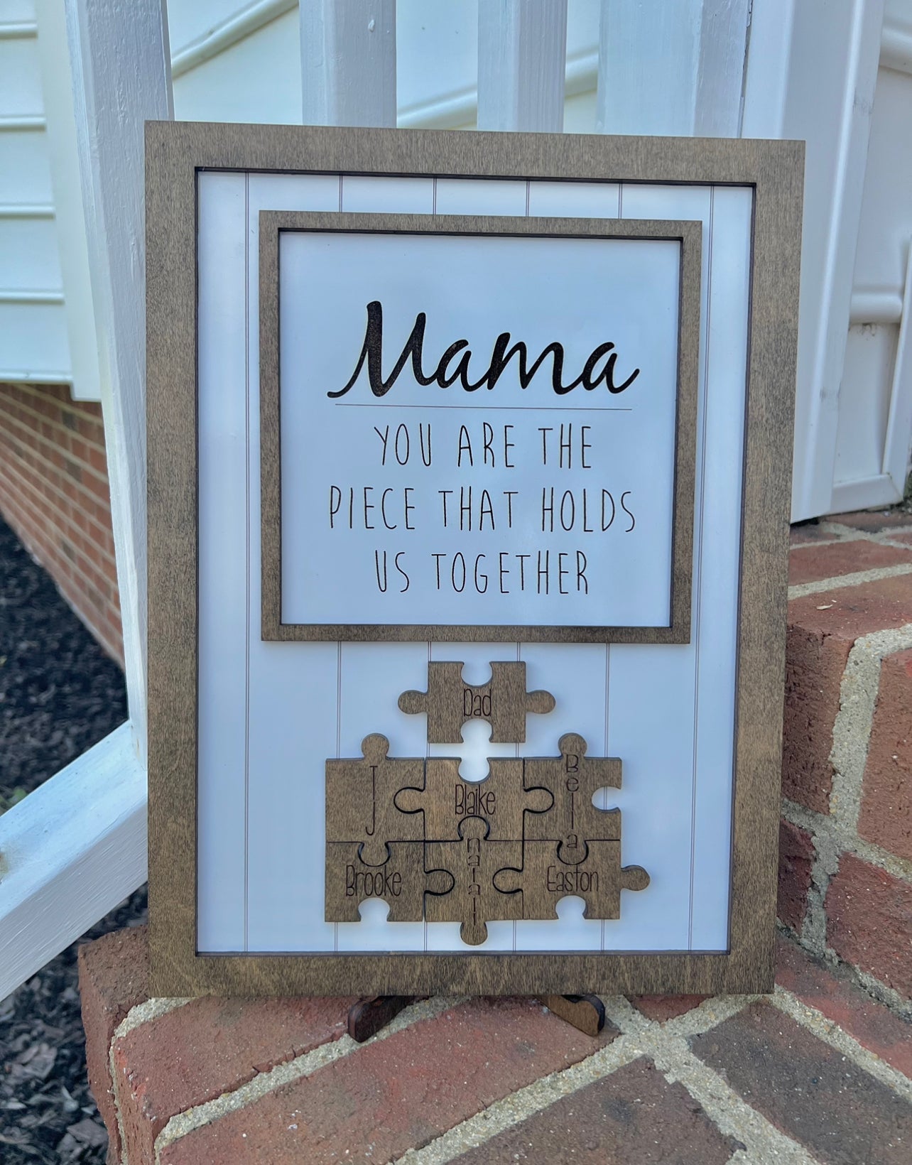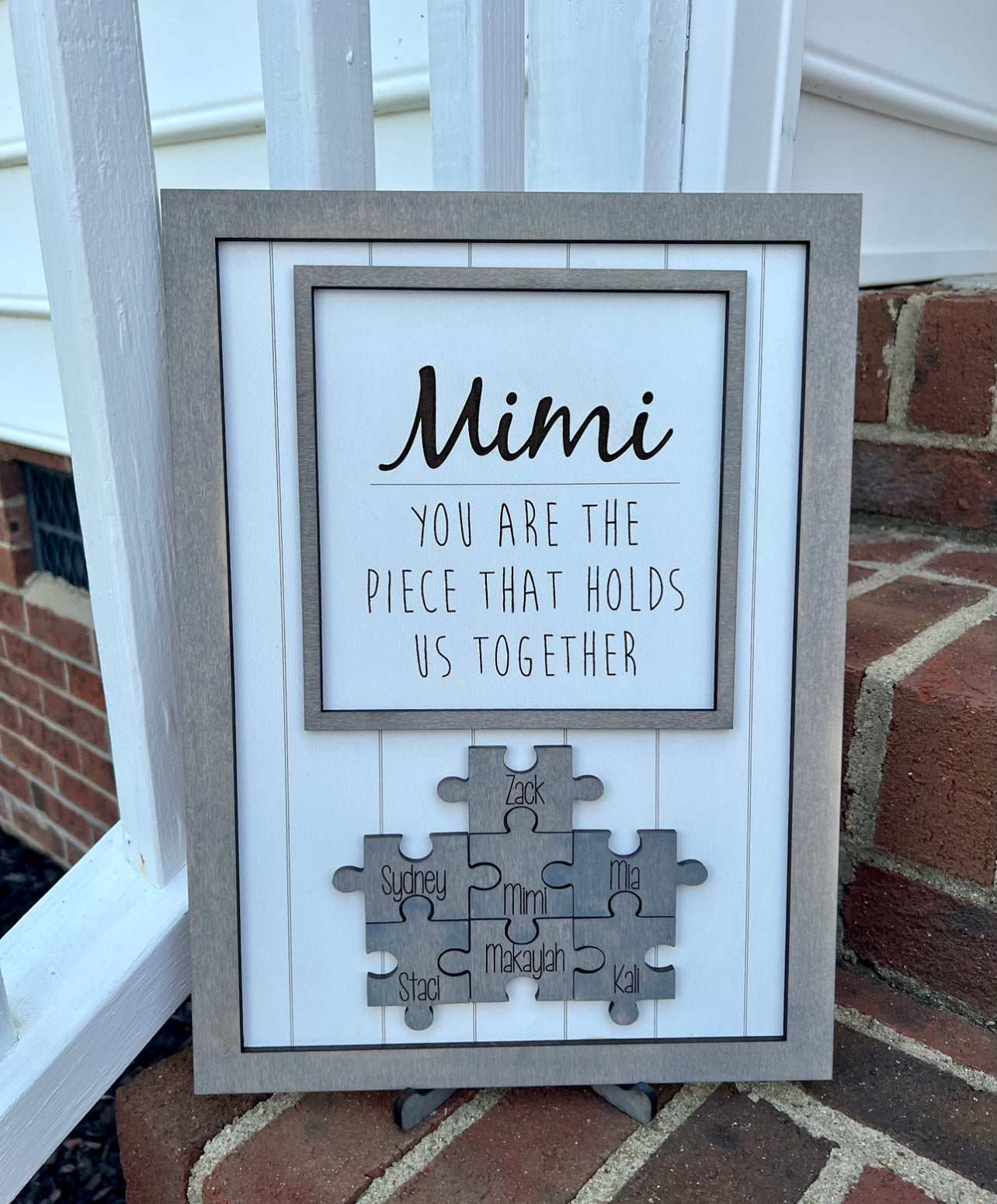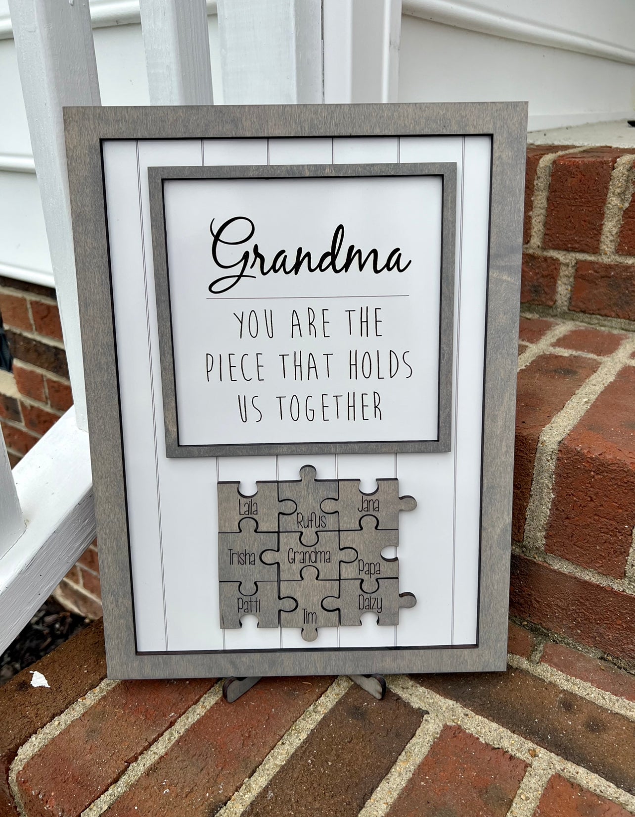 Your choice of stain color, brown or grey. Your choice of title (Mom, Mimi, Grandma, etc. We can accommodate up to 12 puzzle pieces best. Approximately 15.5x10"