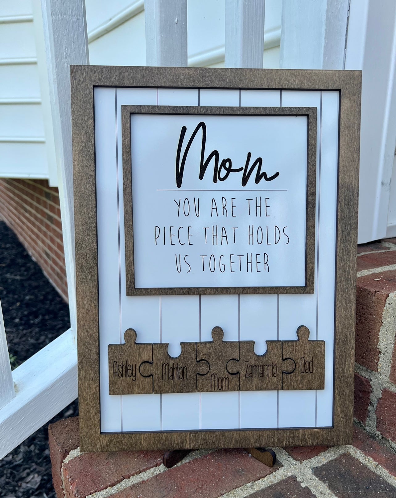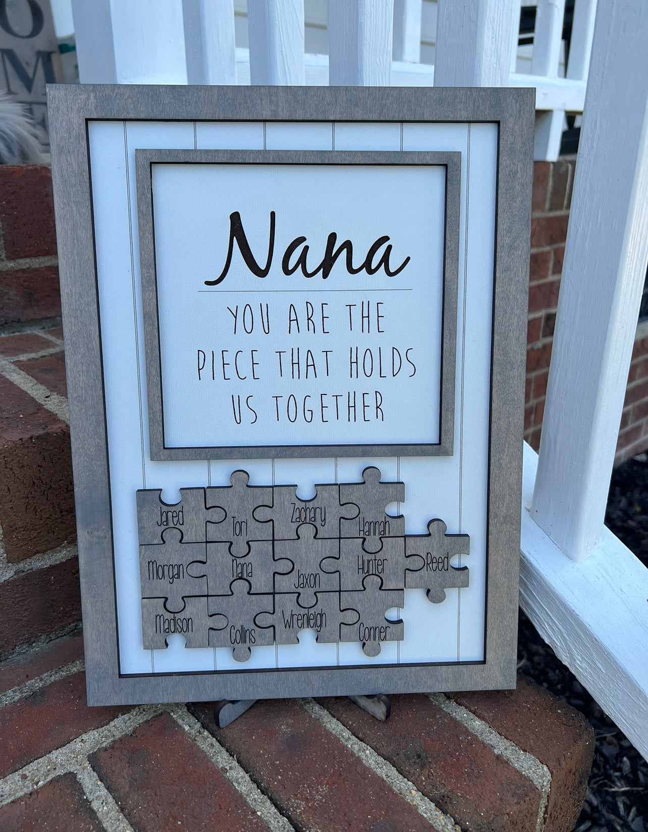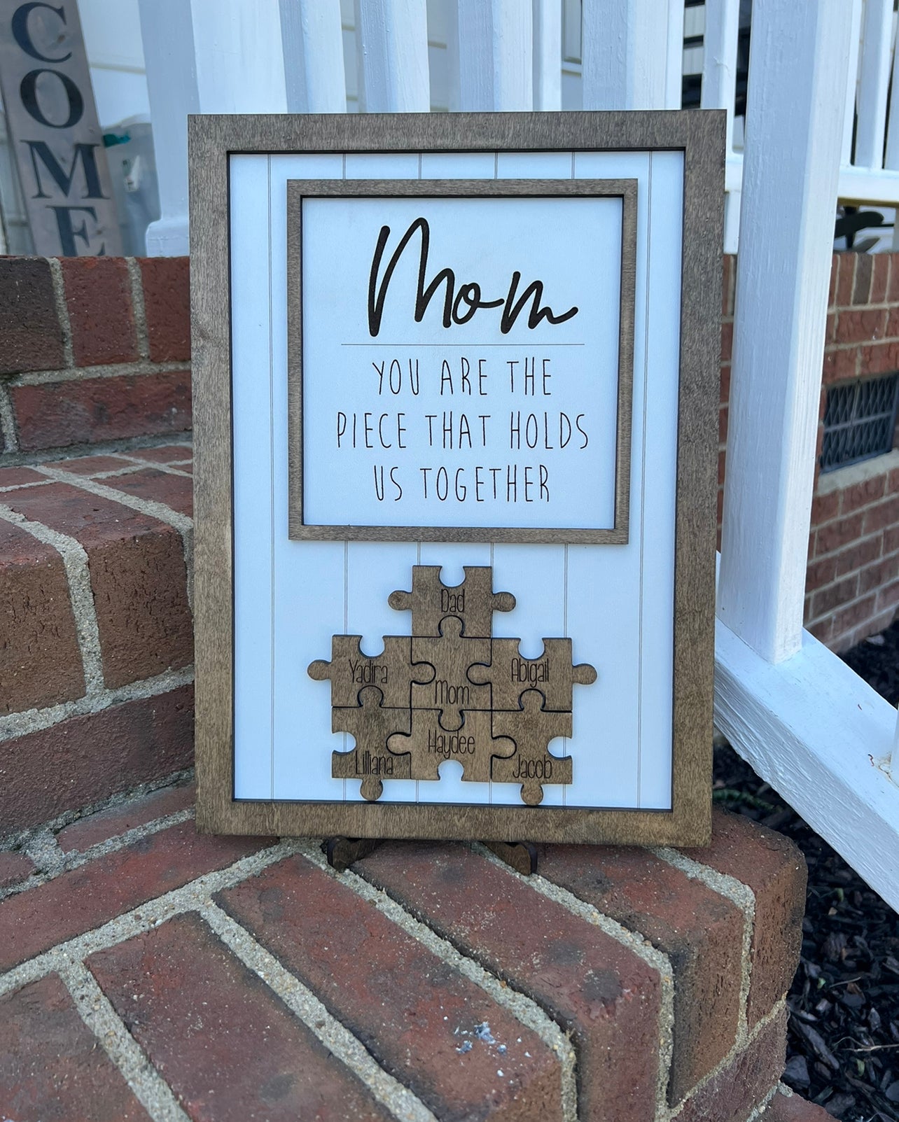 Your choice of stain color, brown or grey. Your choice of title (Mom, Mimi, Grandma, etc. We can accommodate up to 12 puzzle pieces best. Approximately 15.5x10"
