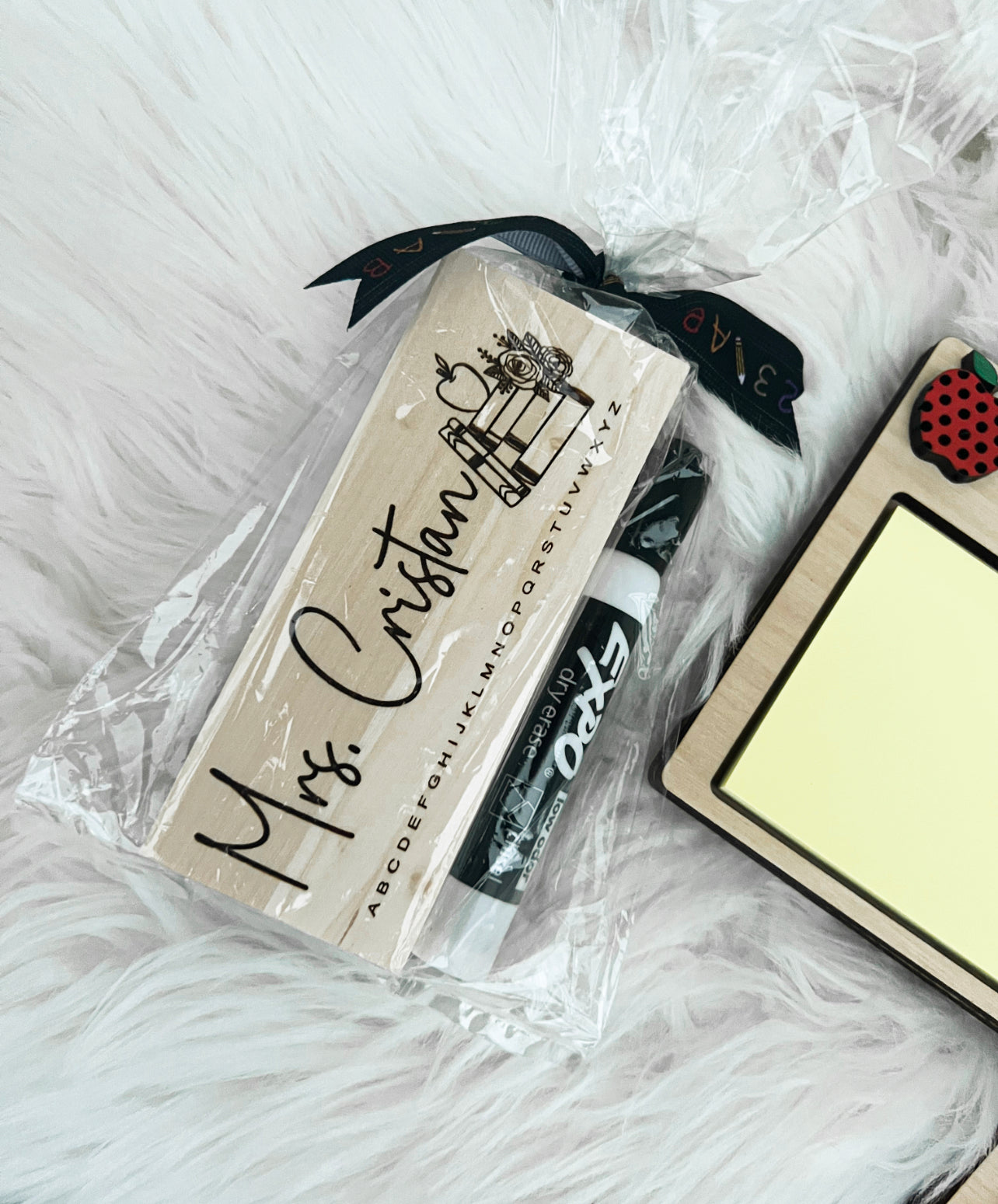 What a cute gift idea! We can engrave your child’s teacher’s name on this wooden eraser perfect for both whiteboards and chalkboards.