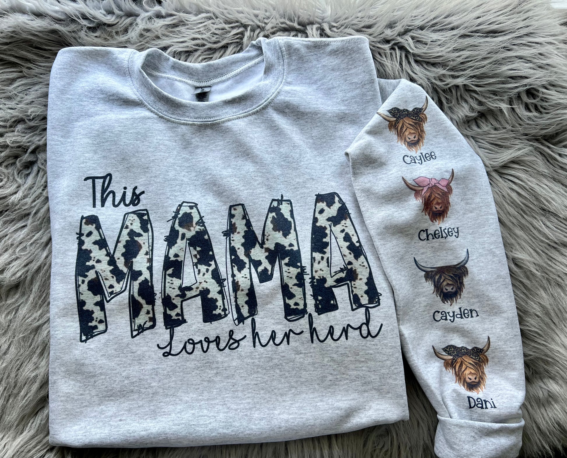 If you choose a short sleeve, the cows will be under the “this mama loves her herd” design on the front - the long sleeve & sweatshirts will have the cows on the sleeve!