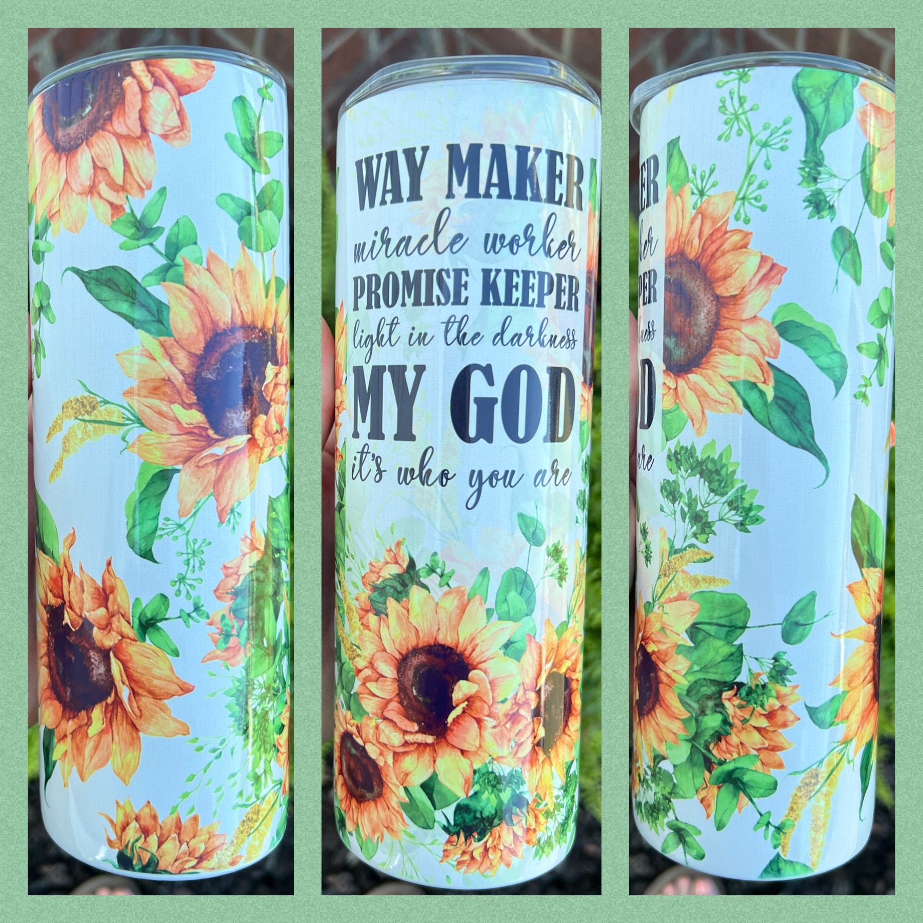 Tumbler reads: Way Maker, miracle worker, promise keeper, light in the darkness, My God, it's who you are.